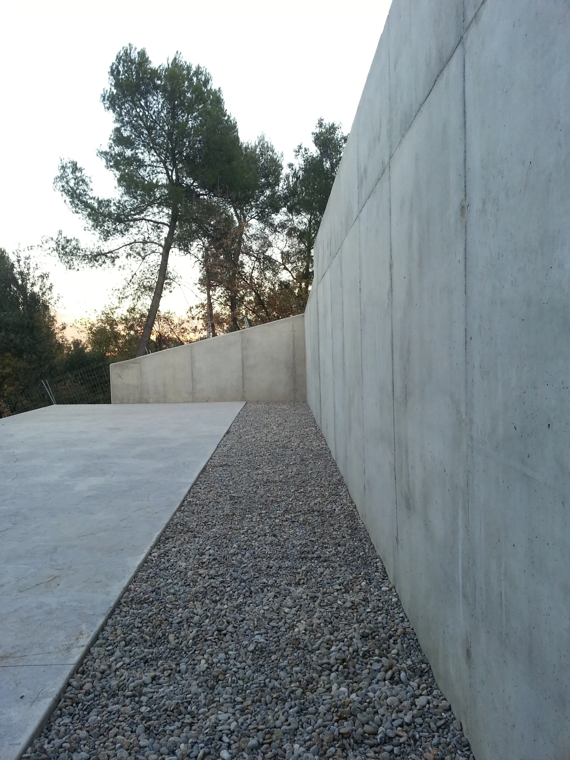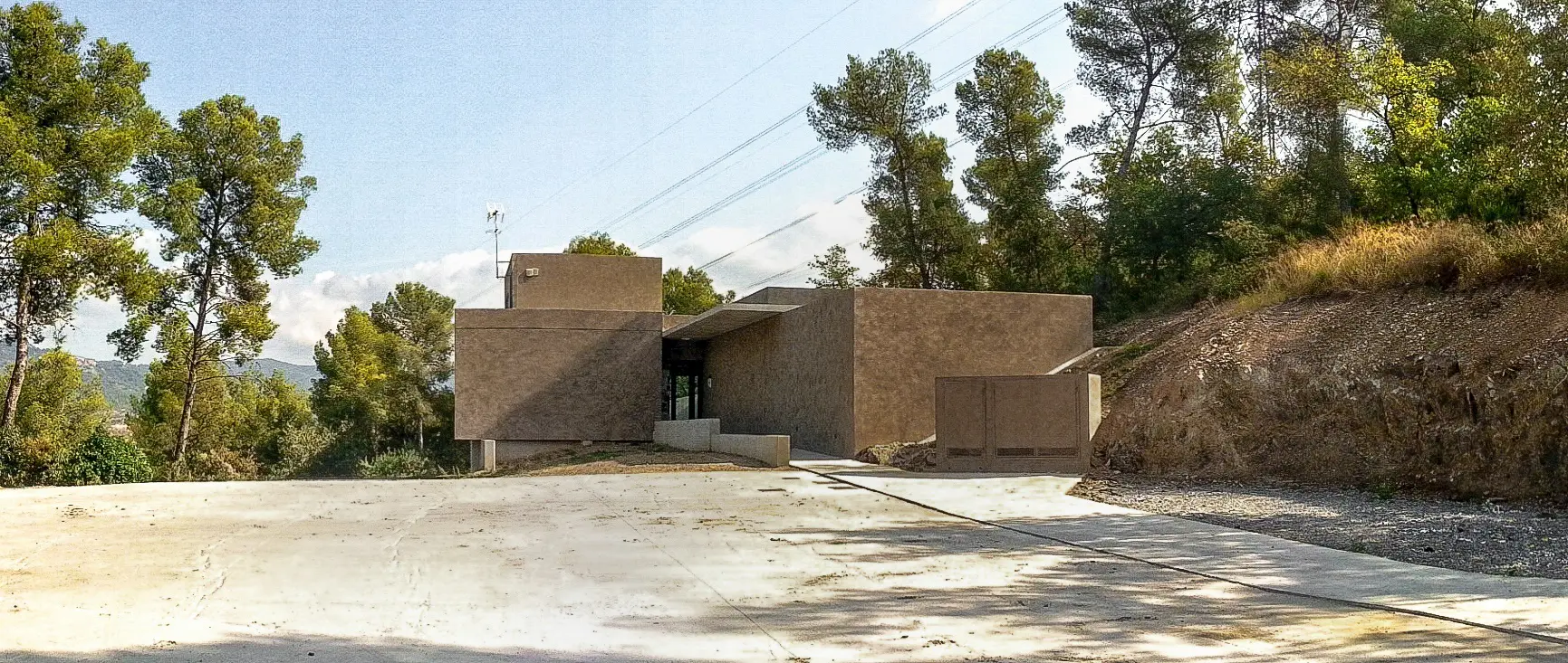La implantación sigue las curvas de nivel para minimizar el impacto ambiental y favorecer la integración paisajística en un entorno forestal. Las fachadas se resuelven con enlucido en tonalidades propias del terreno. La fachada norte, la más visible desde la carretera, se trata con gran opacidad y una imagen monolítica, y se dispone con un voladizo de un metro para reducir el impacto visual en la pendiente.