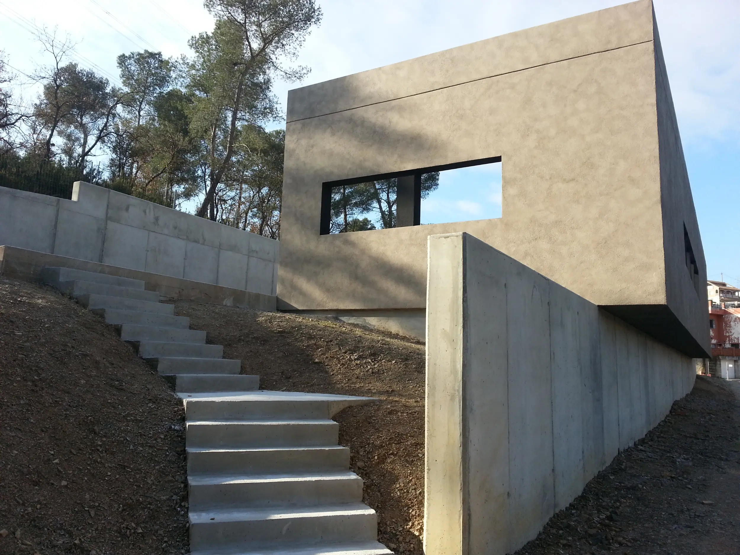 El edificio, de planta única y cubierta plana, se implanta sobre un camino forestal y queda parcialmente semiempotrado en el terreno para adaptarse a la fuerte pendiente existente. La disposición en dos volúmenes lineales desplazados longitudinalmente permite generar, por un lado, un espacio de acceso desde la calle y, por otro, un patio posterior delimitado por el muro de contención de tierras.