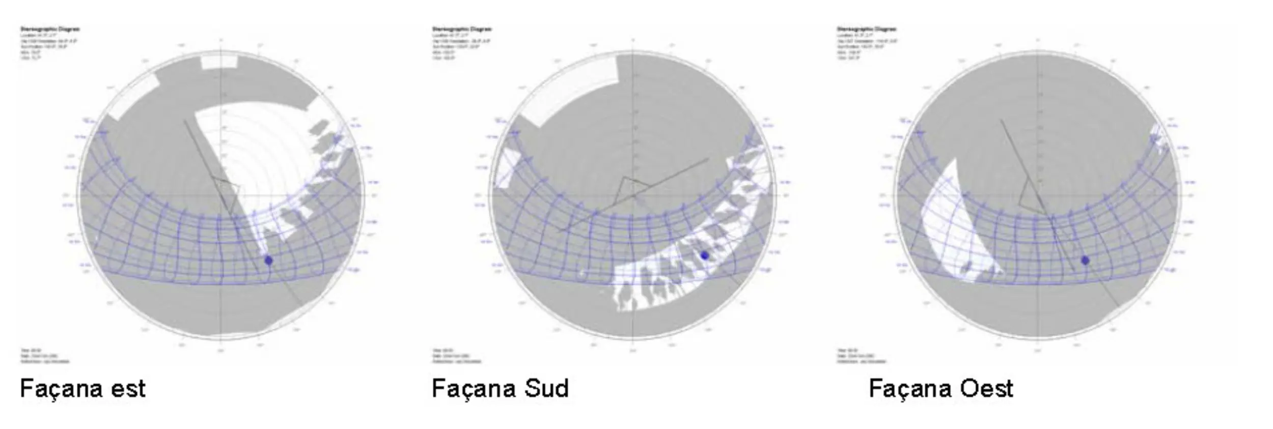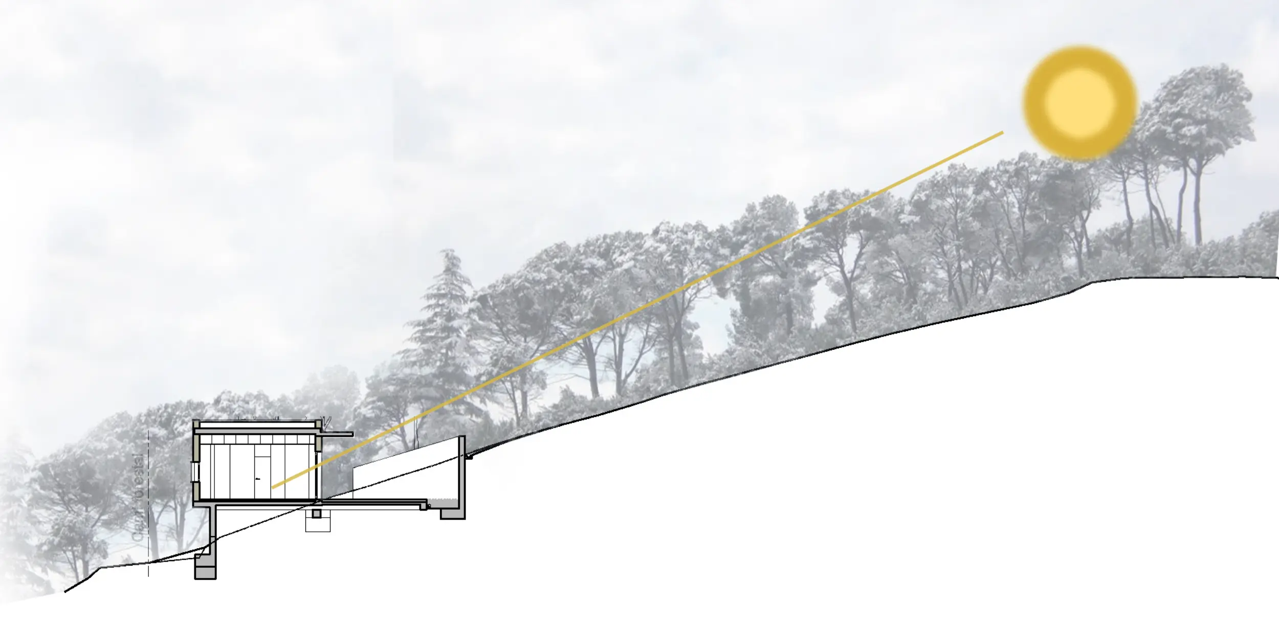 Para minimizar pérdidas térmicas, se reducen las aberturas en la fachada norte y se aprovecha la condición semiempotrada del edificio para mejorar el comportamiento térmico global. Aunque la presencia de pinos reduce más de un 50% la capta