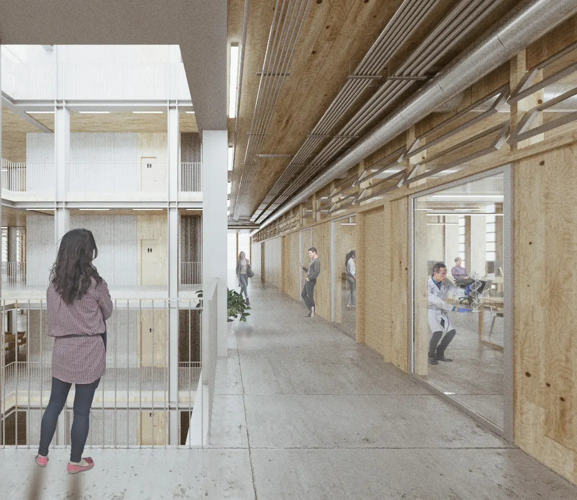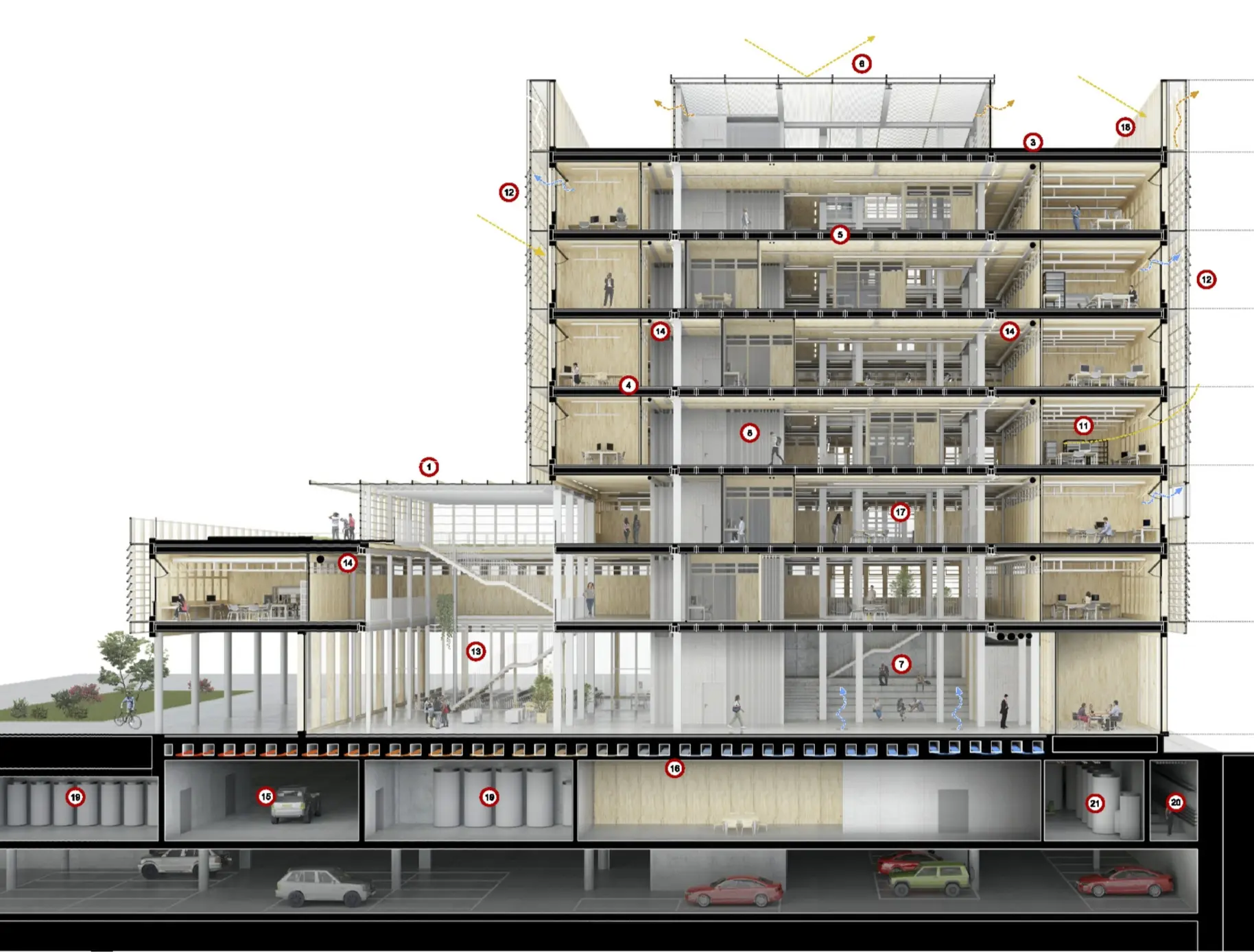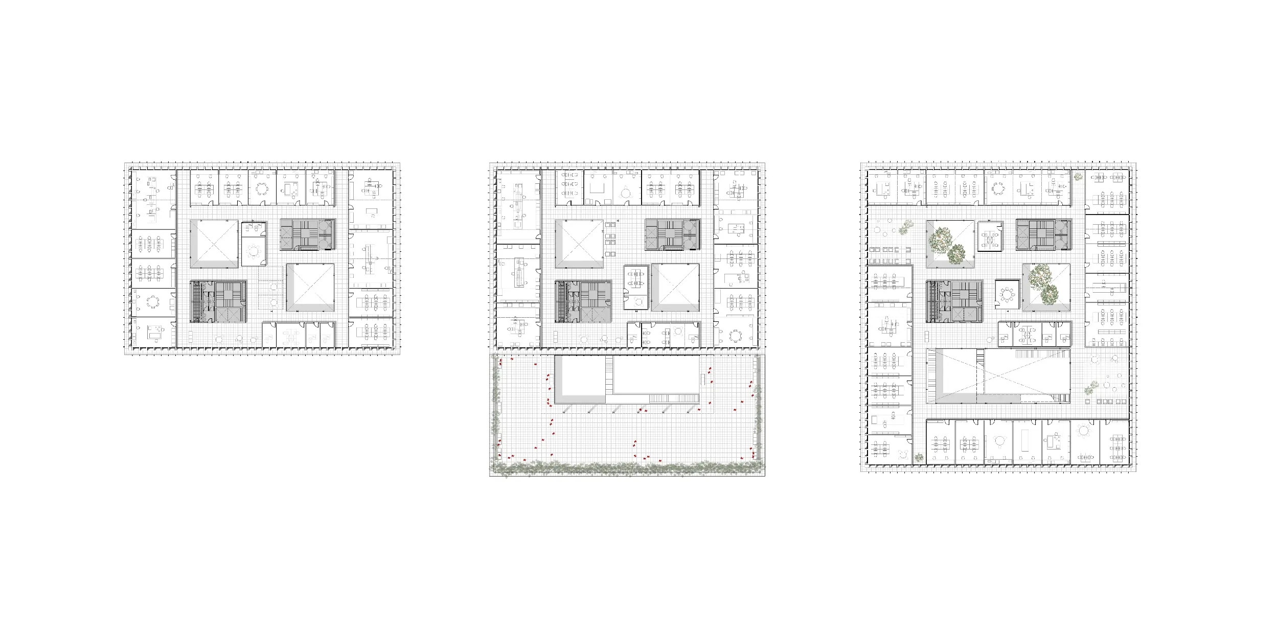 A partir del respeto de los elementos estructurales preexistentes de hormigón armado ya construidos, la nueva propuesta define en su ensamblaje su carácter métrico, regular, dimensional y modular, tanto en sus soportes estructurales como también en sus núcleos de circulación.