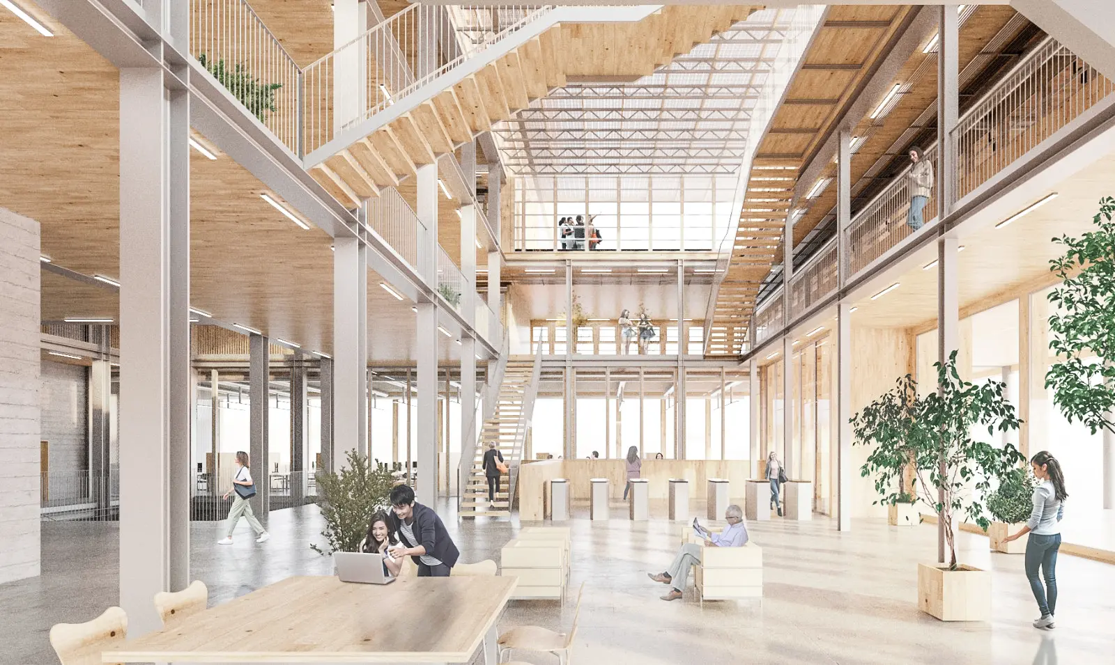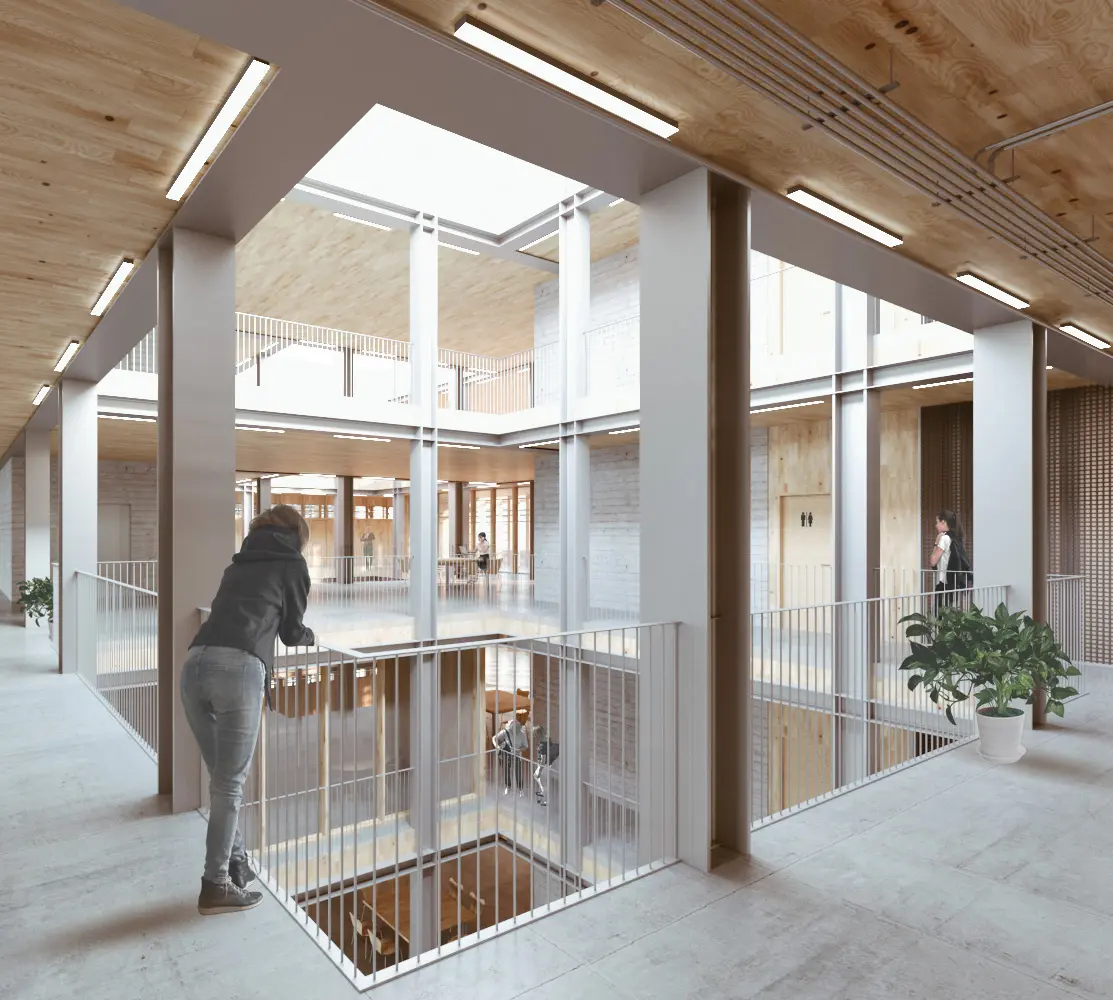 La volumetría permitida en la parte adyacente a la avenida principal del Campus se reduce en altura, de forma que permita, según la propuesta presentada, la utilización de la cubierta como espacio de comunicación y socialización, potenciando el sentido de comunidad de trabajo.