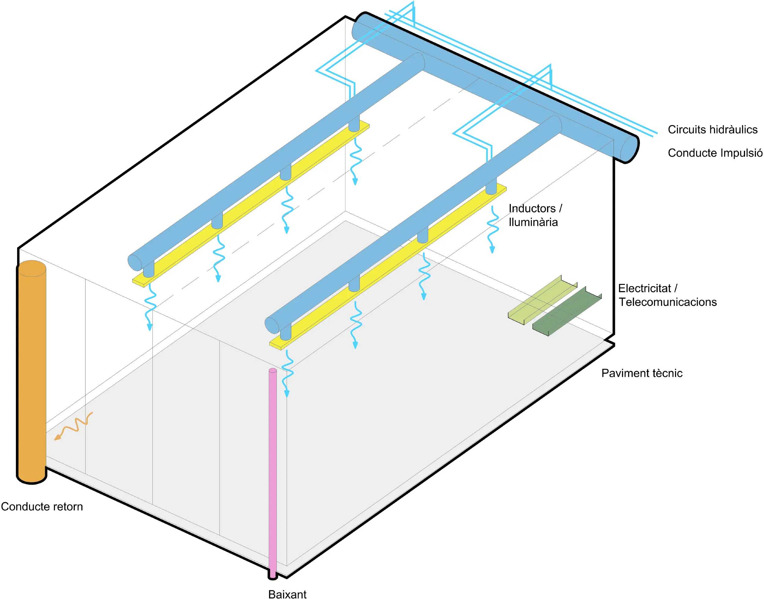 Asimismo, esta doble fachada genera un espacio que verticalmente funciona como una chimenea térmica, extrayendo hacia la cubierta de forma natural por inducción el calor generado en las plantas inferiores.