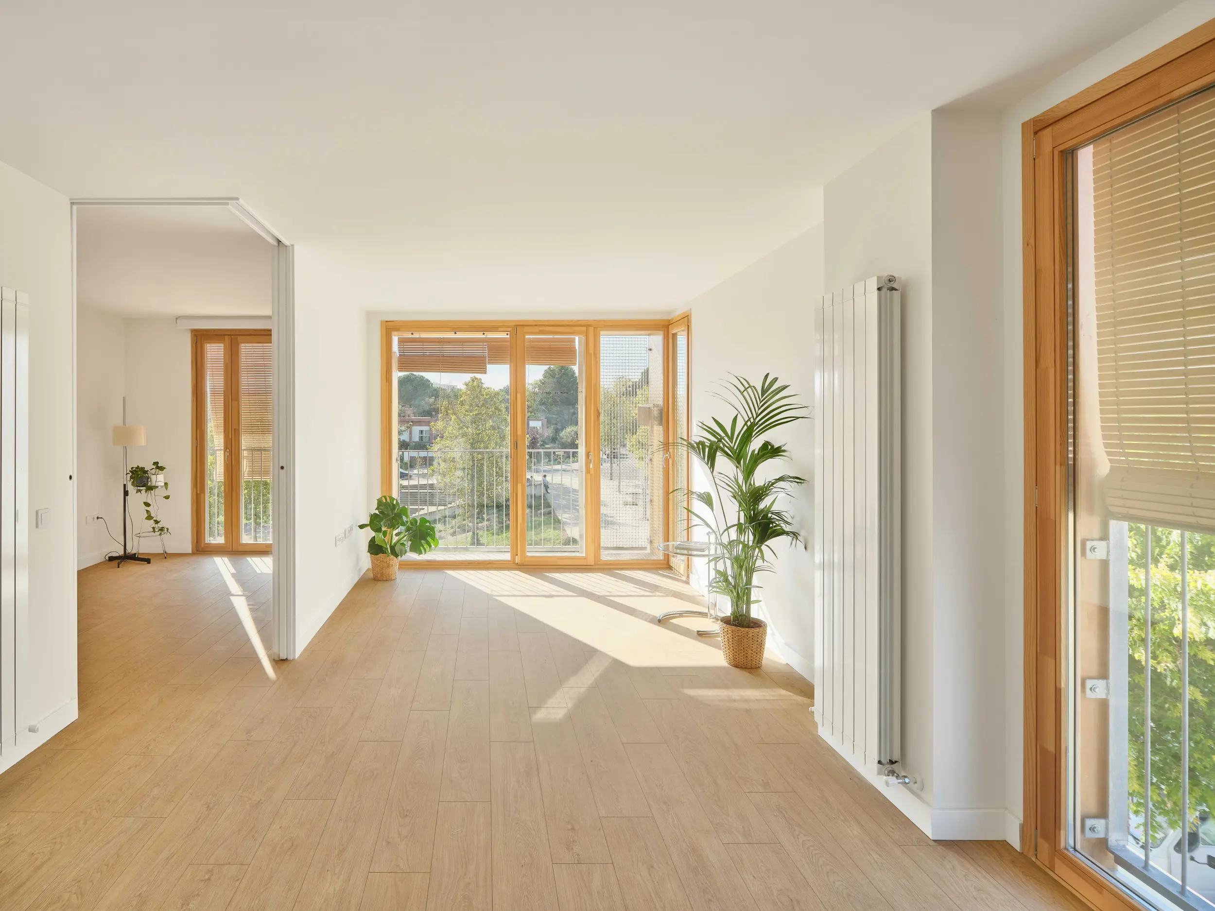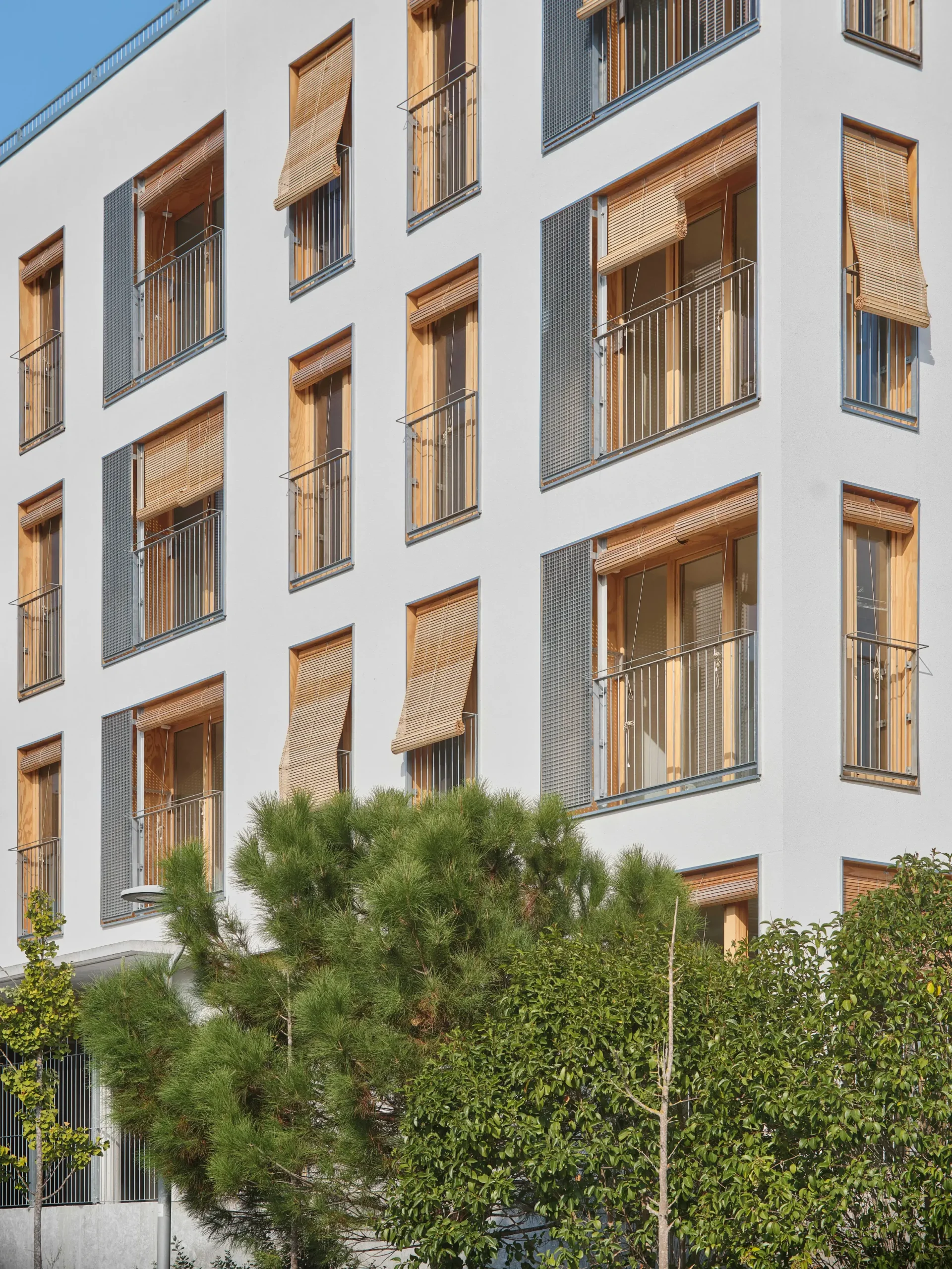 La sostenibilidad se aborda de forma transversal, priorizando la reducción de la demanda energética mediante una envolvente altamente eficiente, ventilación natural cruzada y sistemas de ventilación controlada. El edificio prescinde por completo de combustibles fósiles e incorpora una pérgola fotovoltaica que cubre la totalidad del consumo comunitario. Además, se despliegan estrategias de gestión eficiente del agua, reutilización de aguas grises, pavimentos permeables y sistemas constructivos en seco, pensados para facilitar el desmontaje y la reutilización futura.