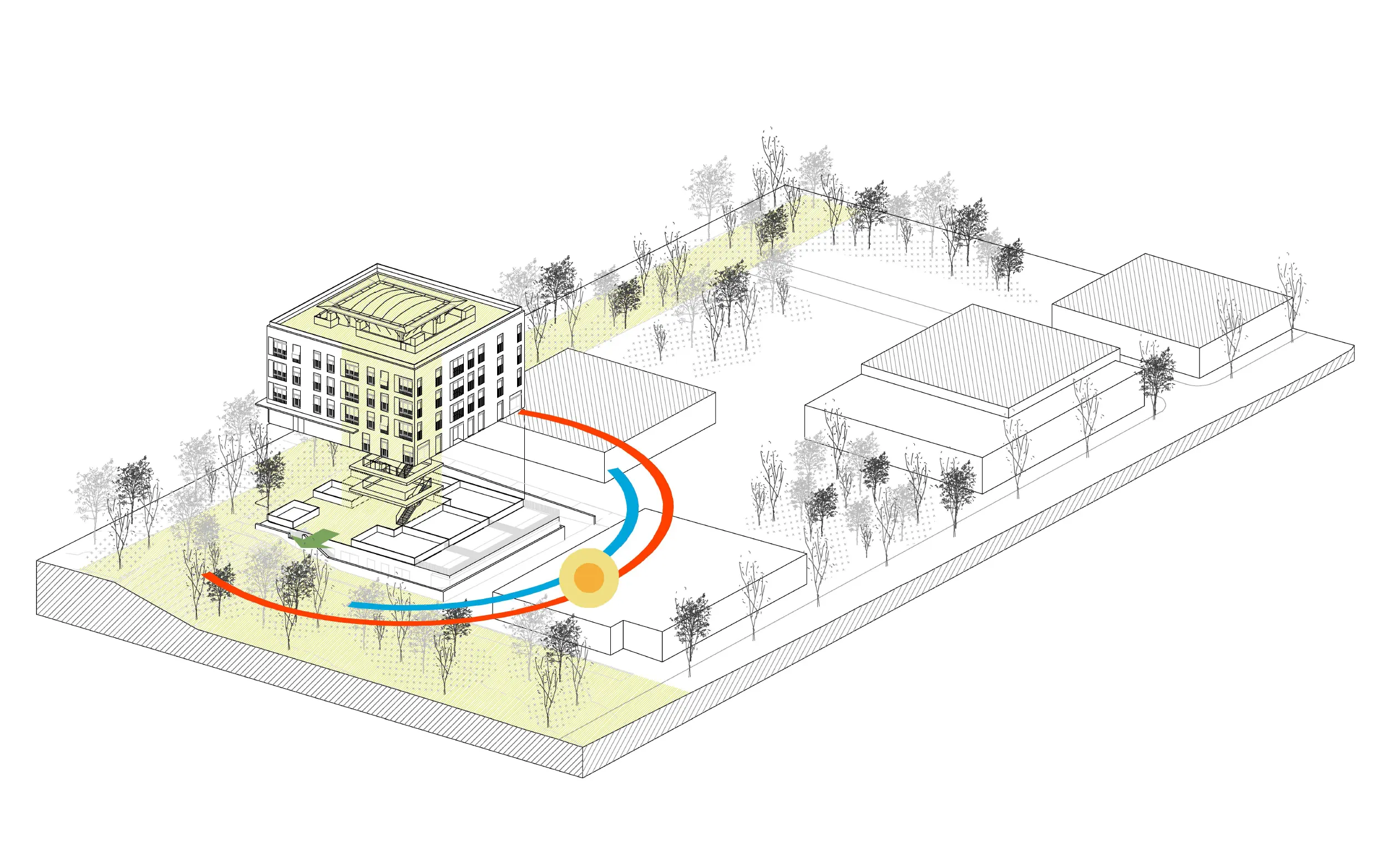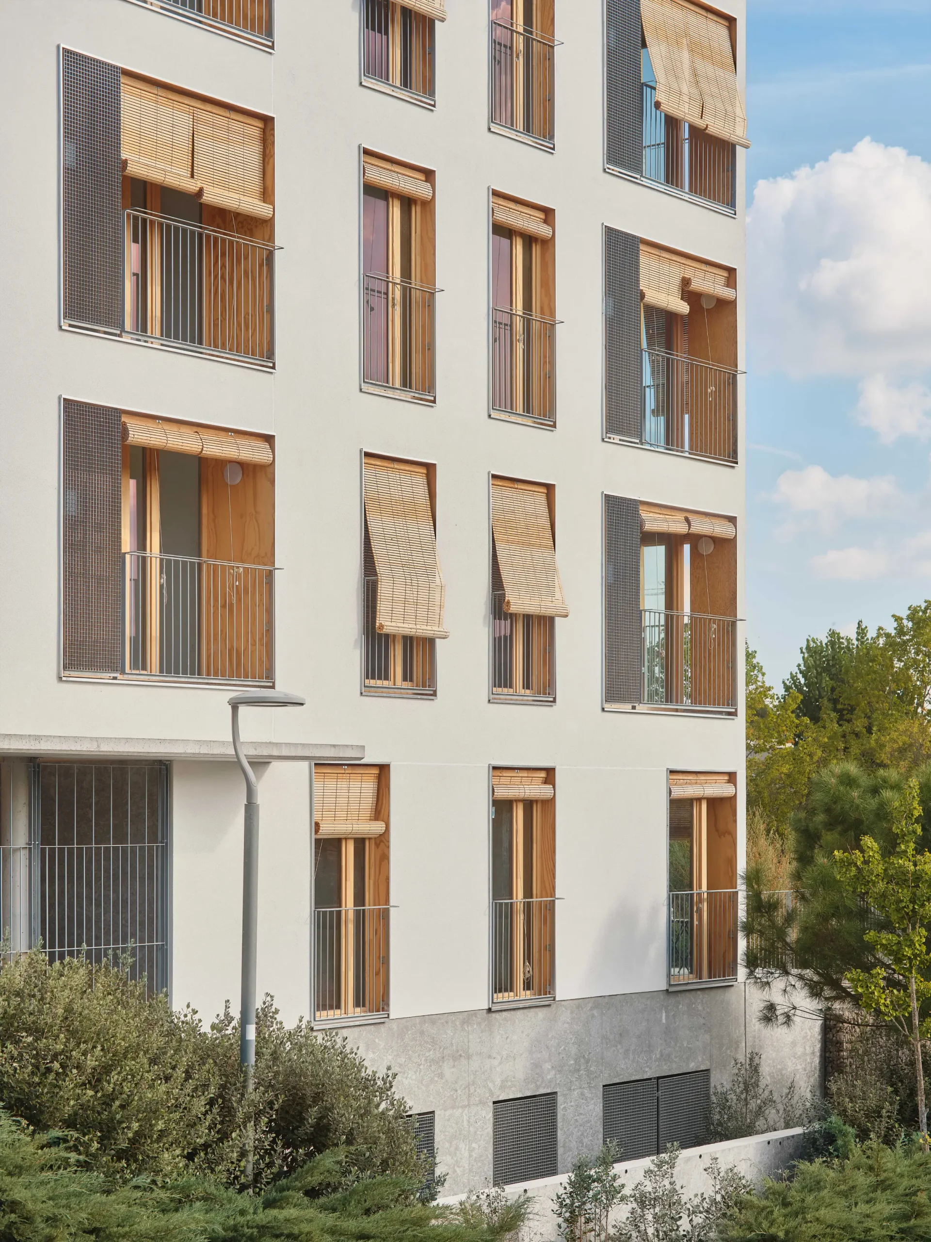 El edificio completa un conjunto de vivienda social existente y se convierte en una pieza de transición entre el tejido urbano y el parque adyacente. Esta condición intermedia se resuelve mediante un patio central abierto y ventilado que permite que el espacio público penetre en el edificio, prolongando los recorridos de la calle hasta la cubierta. La planta baja se libera casi por completo para reforzar esta continuidad, transformándose en un espacio comunitario abierto en el barrio.
