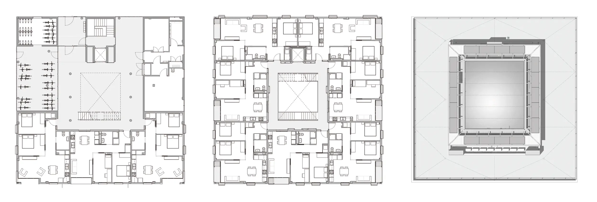 La liberación de la planta baja obliga a reformular la organización tipológica de las viviendas. El proyecto pasa de seis a siete viviendas por planta tipo, apostando por unidades más compactas pero espacialmente más flexibles. La destrucción de la esquina interior permite diluir los límites entre aposentos, generando una mayor amplitud perceptiva y evitando soluciones excesivamente compartimentadas. Esta estrategia busca garantizar calidad espacial y adaptabilidad en viviendas de dimensiones ajustadas.