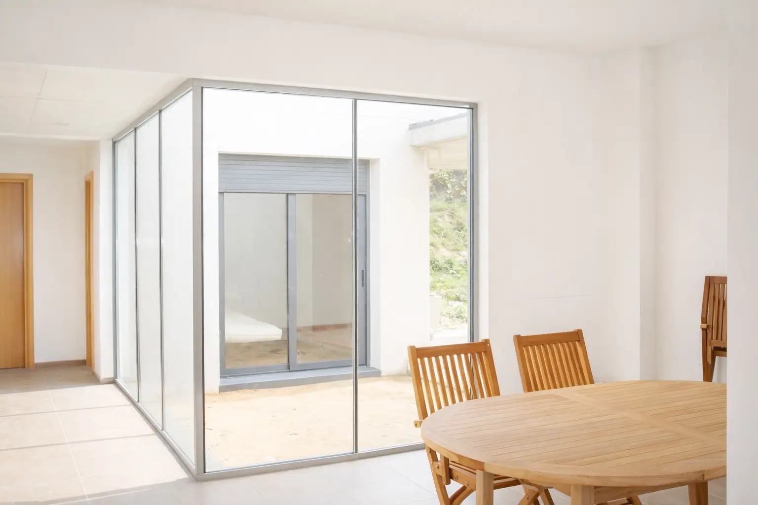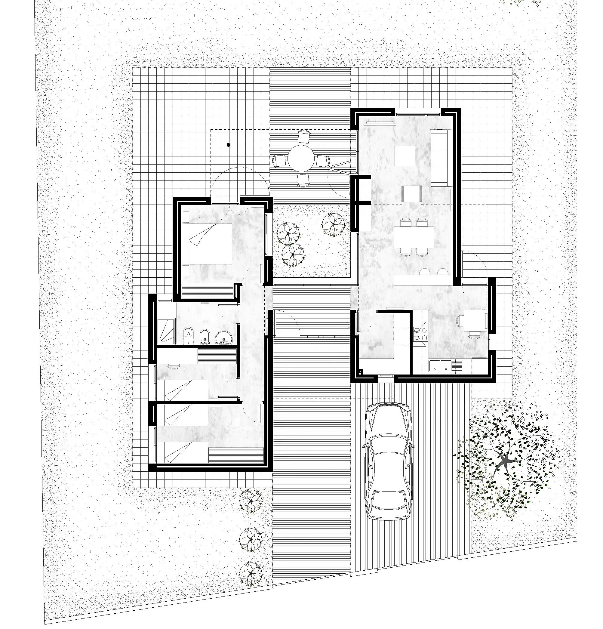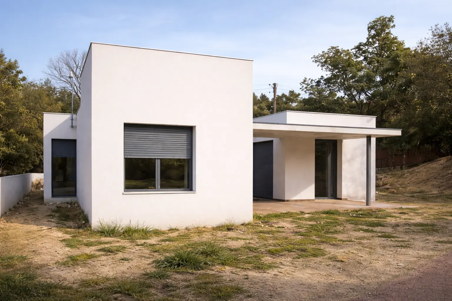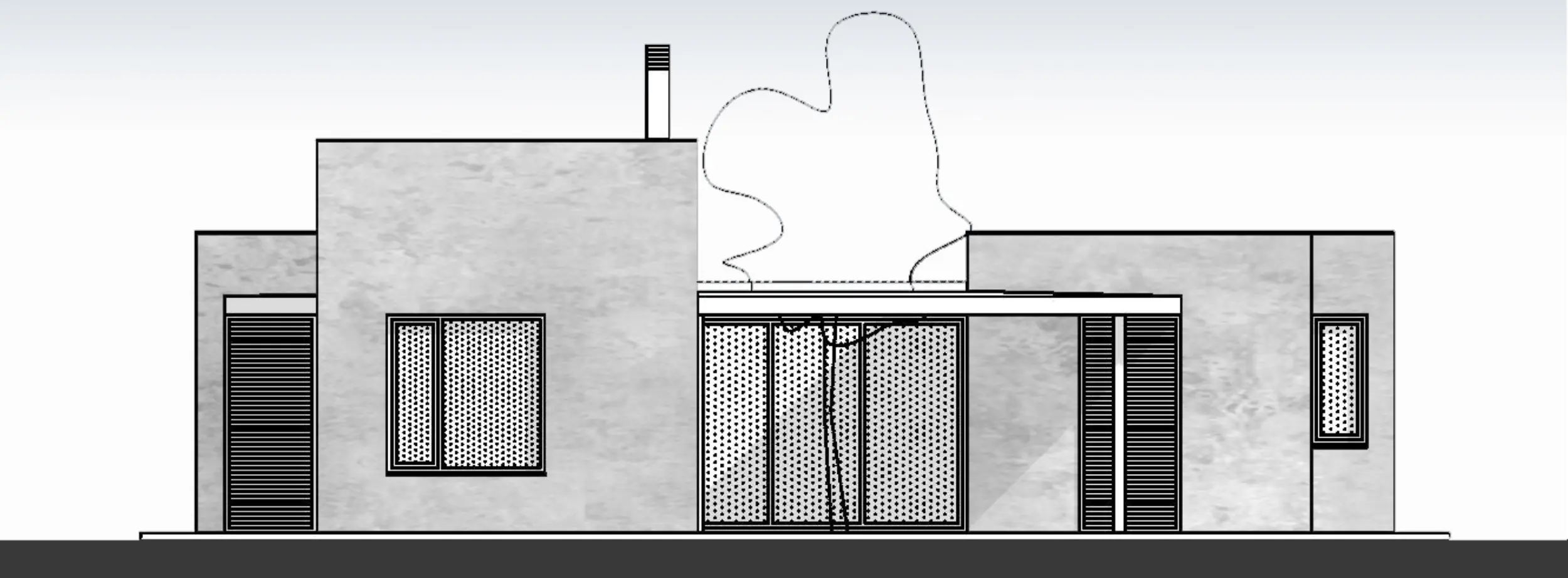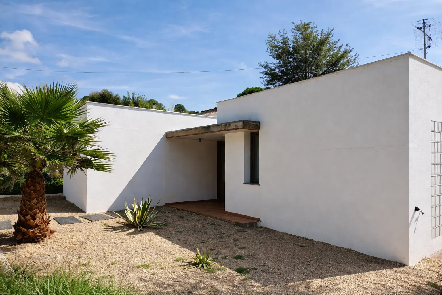 El proyecto consiste en la construcción de una vivienda unifamiliar aislada desarrollada íntegramente en planta baja, situada en el municipio de Caldes de Malavella (Girona). La parcela, de 995,40 m² y forma trapezoidal, presenta una fachada de 20,00 m, una profundidad máxima de 51,39 m y una orientación principal noreste. El terreno es prácticamente llano, con un desnivel máximo de 1,30 my una pendiente aproximada del 1% en la zona edificable. La vivienda se organiza en dos volúmenes diferenciados correspondientes a la zona de día y la zona de noche, relacionados visualmente mediante patio interior. El programa funcional incluye recibidor, salón-comedor con cocina americana, lavadero, distribuidor, un baño, dos habitaciones dobles y una habitación individual, con una disposición que prioriza la orientación, el soleamiento y las vistas.