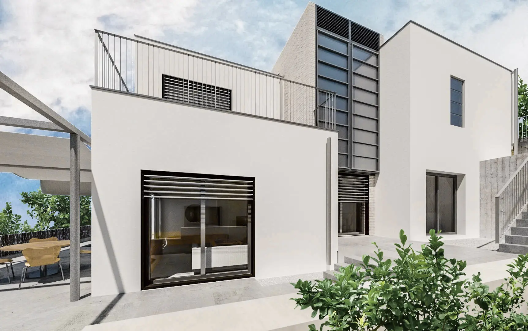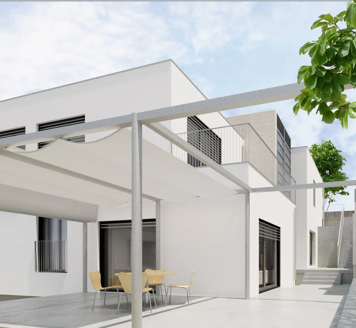 La fragmentación ortogonal de la planta estructura el proyecto y permite organizar el programa en niveles decalados, favoreciendo la relación con el exterior. Los espacios libres se articulan con pérgolas y zonas de ocio sin obstáculos, potenciando la continuidad entre interior y exterior y aprovechando el desnivel natural del terreno.