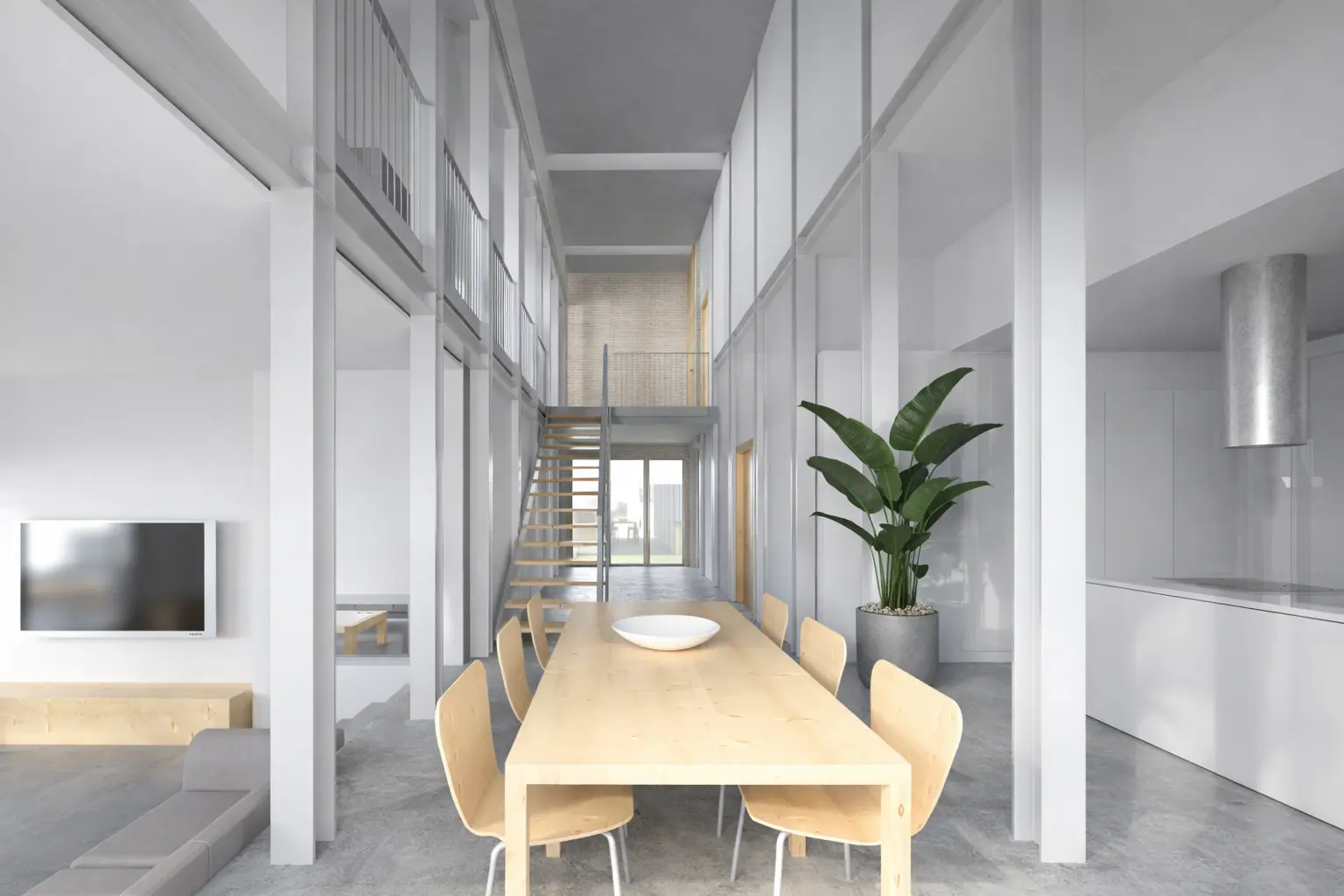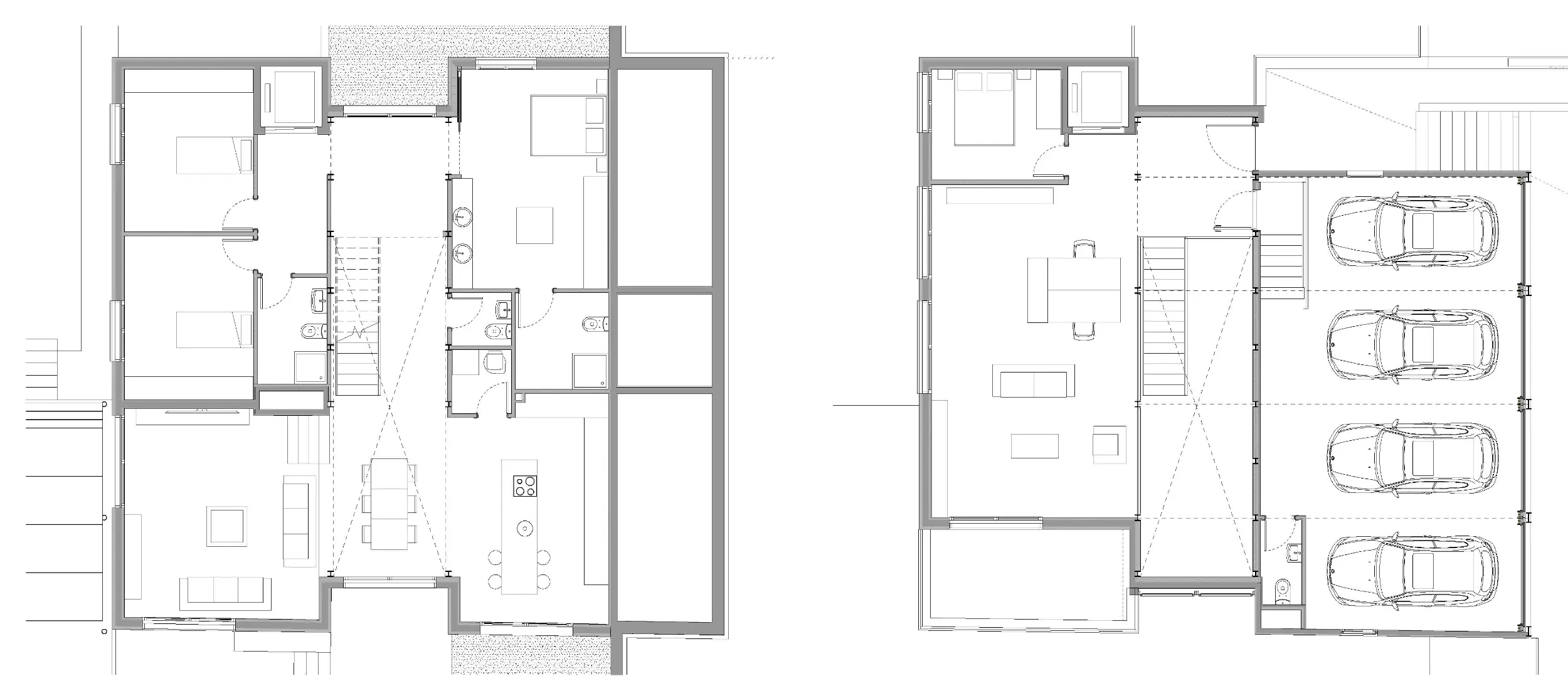 El acceso principal se produce por el nivel superior, donde se dispone el parking con capacidad para cuatro coches, el recibidor, un estudio y un baño, concentrando los espacios más utilitarios. En la planta inferior se sitúan los principales espacios domésticos —cocina, salón-comedor, tres dormitorios dobles, vestidor y tres baños— abiertos visual y funcionalmente hacia el jardín posterior con piscina.
