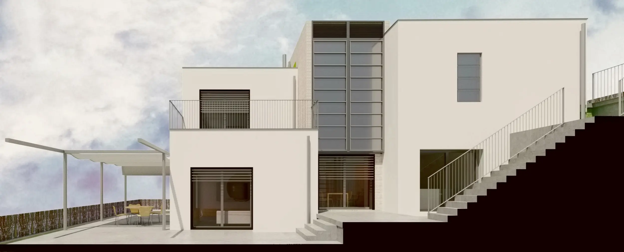 El proyecto corresponde a una vivienda unifamiliar situada en un solar rectangular con un desnivel aproximado de 5 metros, en el Vallès Occidental. La edificación, libre de antecedentes construidos, se implanta adaptándose a la topografía mediante un volumen escalonado de dos plantas.