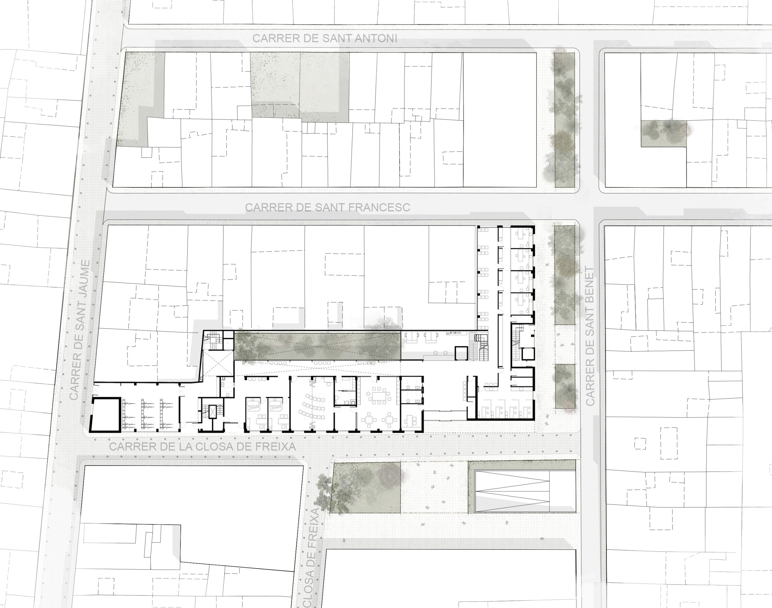 El projecte es concep com una peça compacta i permeable que dialoga amb l’entorn existent mitjançant una arquitectura contemporània que reinterpreta la identitat del lloc. La planta baixa té un paper clau en aquesta relació, amb una plaça semicoberta que amplia la vorera i esdevé un espai de trobada vinculat al CAP i al sistema d’espais públics.